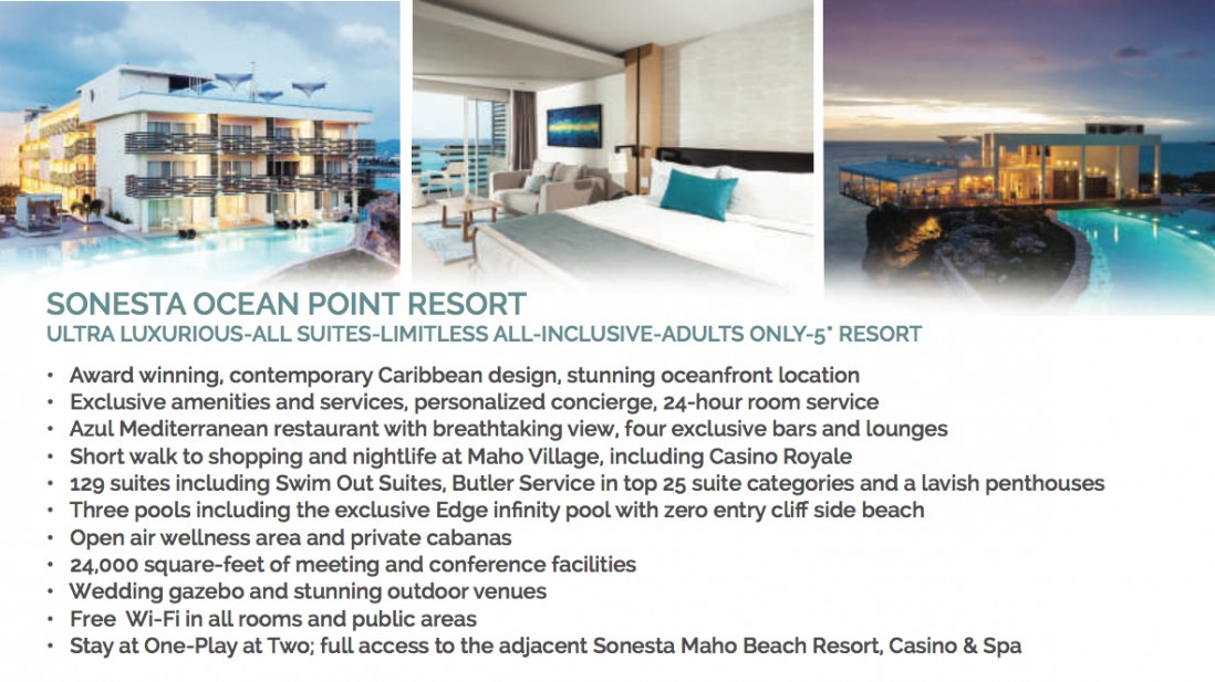 Sonesta Resorts offers the signature "Stay at One Play at Two" for guests of Sonesta Ocean Point to fully experience both properties. Starting February 1, 2019, Sonesta Ocean Point guests will have access to the facilities at Sonesta Maho Beach Resort, coinciding with the re-opening. We will of course provide site inspections for both properties for all agents and of facilities available at Sonesta Maho Beach Resort prior to the re-opening.