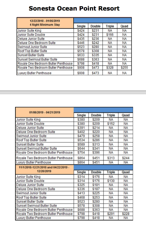 Sonesta Ocean Point Resort travel dates are November 15 – December 21, 2018 and January 6 – December 20, 2019. All-Inclusive room rates for a Junior Suite are $145 per person, per night and an upgraded room category is based on availability, subject to surcharge or lowest available rate. This resort is adults-only, and no children under the age of 18 are allowed.
